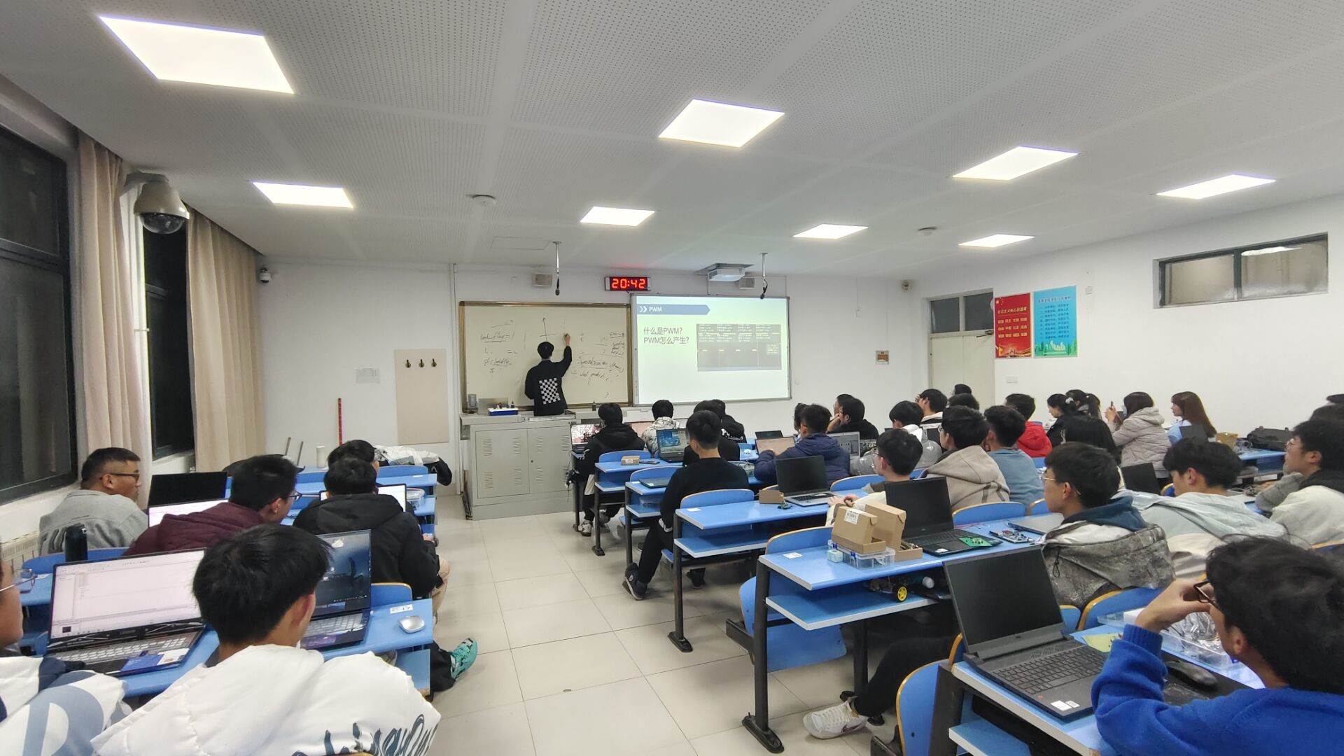 2023年12月16日,J7-212,为了拓展单片机开发基础,介绍单片机的相关应用,现面向自动控制协会全体成员,举办此次讲座,以讲练结合的形式。向社团成员介绍单片机的中断系统有关知识,并对所学知识进行练习。活动过程中会出现有些学生不理解讲课内容的问题,但各个组长都及时做出调整,使绝大多数同学都跟上来了。各个组长及会长也是很认真负责,非常照顾绝大多数的学生。各位组长以及会长起到了良好的积极作用,积极上台鼓励同学努力学习,积极帮助同学解决问题。